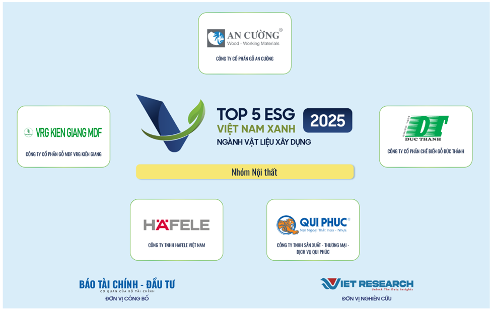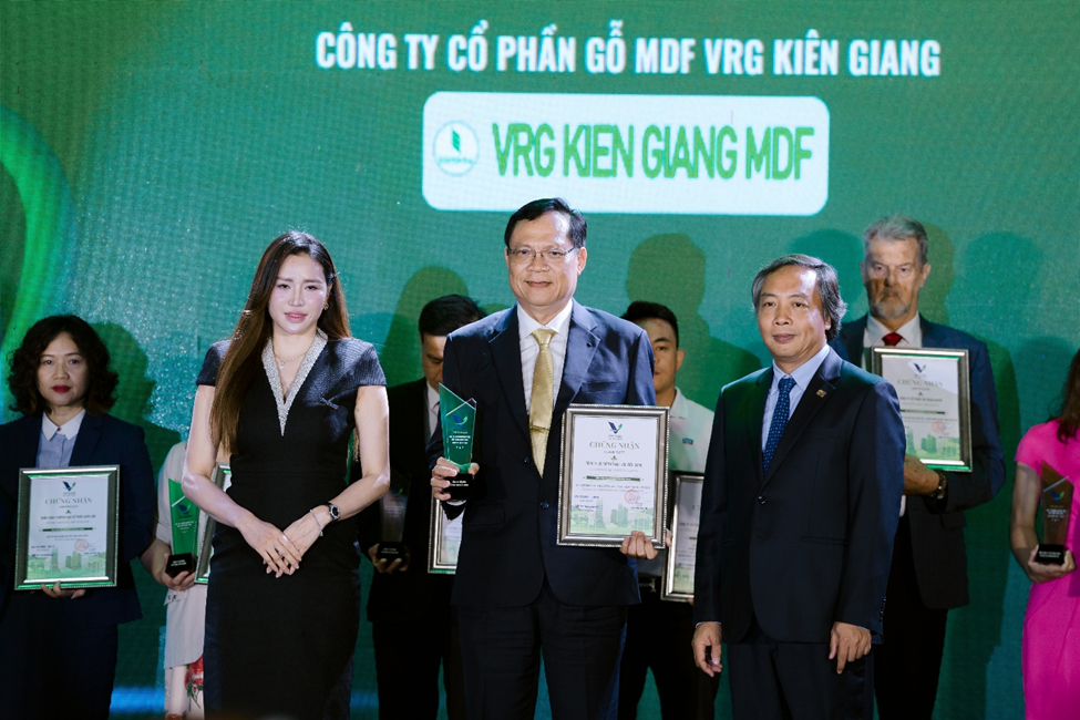 Tại lễ công bố Top 100 Doanh nghiệp ESG Việt Nam Xanh 2025 (ESG100), Top 10 Doanh nghiệp ESG Việt Nam Xanh 2025 trong các ngành (ESG10) do Báo Tài chính - Đầu tư (Bộ Tài chính) phối hợp cùng Công ty Cổ phần Nghiên cứu Kinh doanh Việt Nam (Viet Research) vào ngày 27/6/2025, Công ty Cổ phần Gỗ MDF VRG Kiên Giang được vinh danh trong Top 10 Doanh nghiệp ESG Việt Nam Xanh 2025 – Ngành Vật liệu Xây dựng (ESG10 - 2025) . Đây là sự ghi nhận xứng đáng cho những nỗ lực bền bỉ của Gỗ MDF VRG Kiên Giang trong việc phát triển ngành công nghiệp chế biến gỗ MDF theo hướng xanh, bền vững và có trách nhiệm cao đối với môi trường, xã hội.
